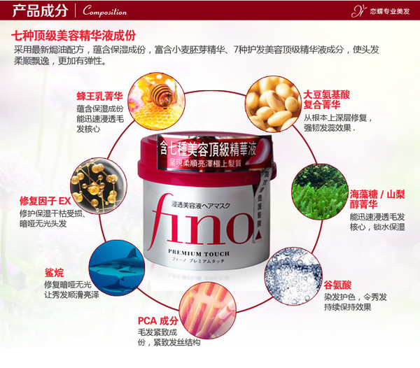 – Kem ủ & hấp tóc Fino giàu Vitamin E chiết xuất mầm lúa mì có tác dụng chống oxy hóa, điều hòa bề mặt lớp biểu bì tóc, vì vậy tóc trở nên ẩm ướt, trơn tru.